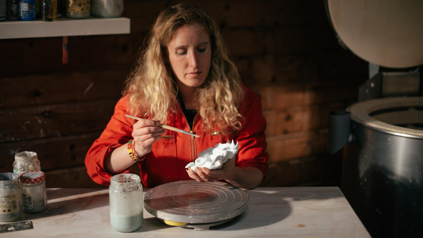 Dit is mijn persoonlijke “woman cave,” een plek waar ik me kan terugtrekken en verdwalen in mijn fantasiewereld tussen porselein, klei en glazuren.