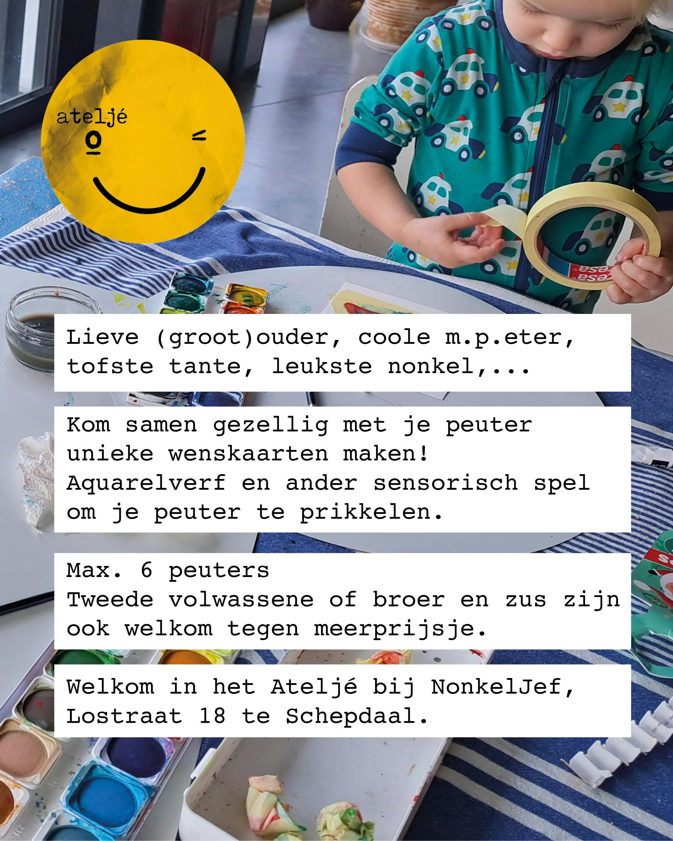 Ben jij die die lieve (groot)ouder, coole metie of leuke oom die graag wil qualitiy timen in een gezellig atelier?! Zin in samen creëren, op het ritme van de peuter, zonder opruim?!In deze workshop ga je met je peuter creatief aan de slag met aquarelverf en collage.
